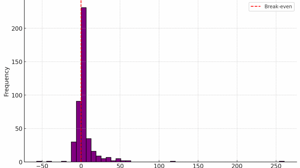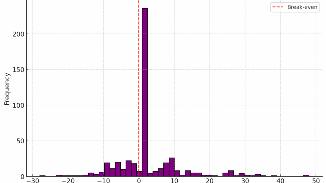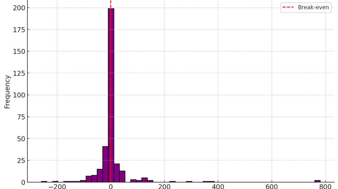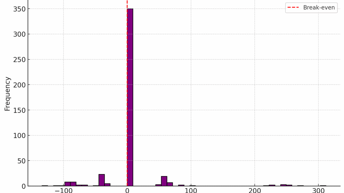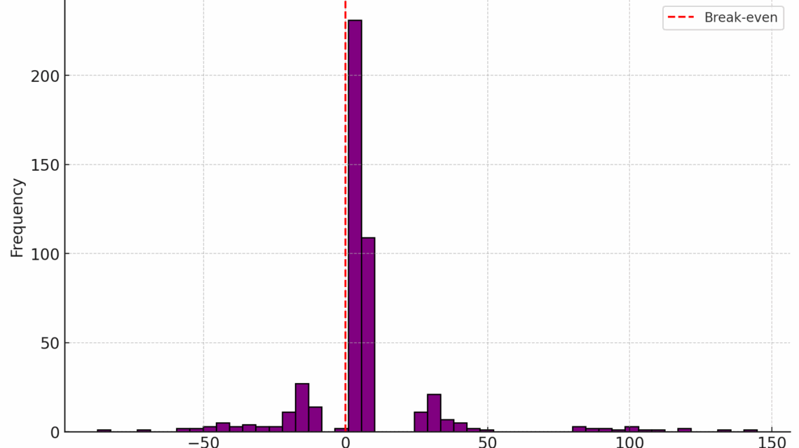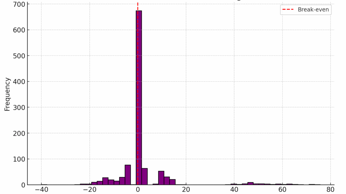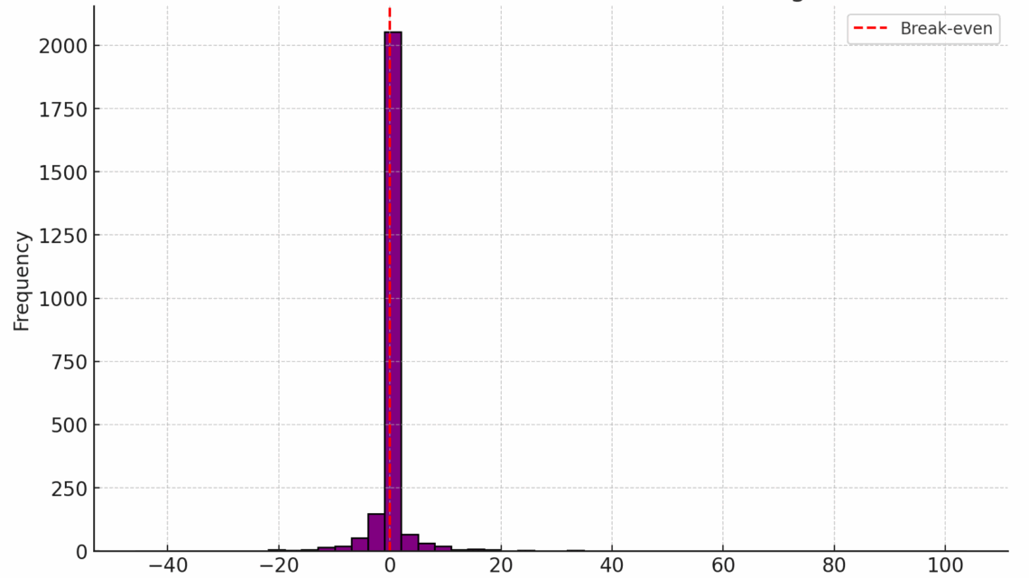 - 📉 交易直方图 —— 以小额盈利($5–$15)为主;亏损更少且通常更小(−$5…−$50)。