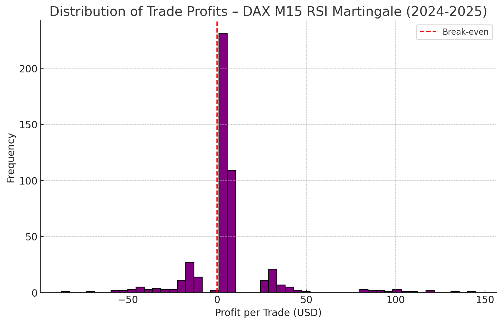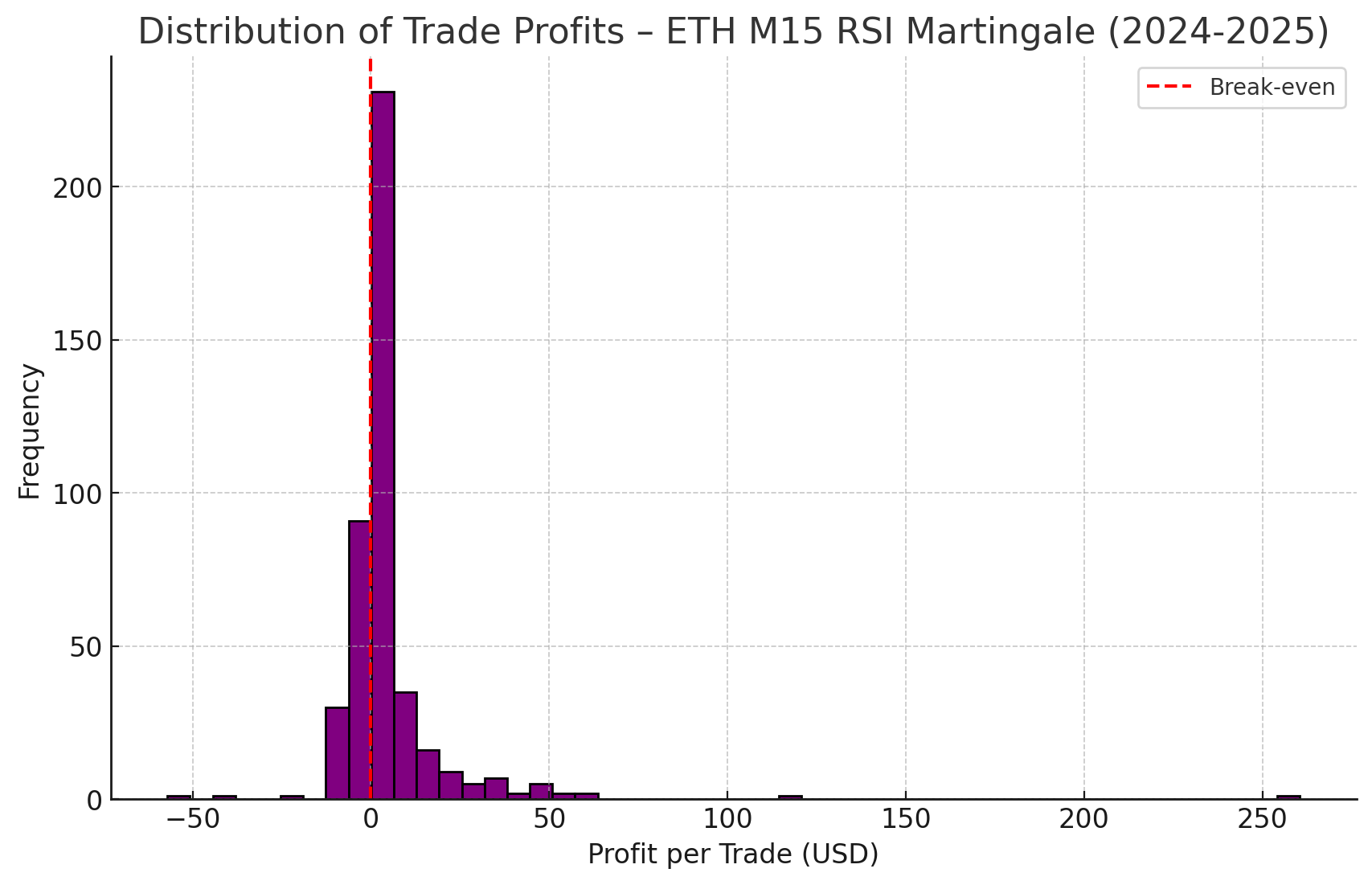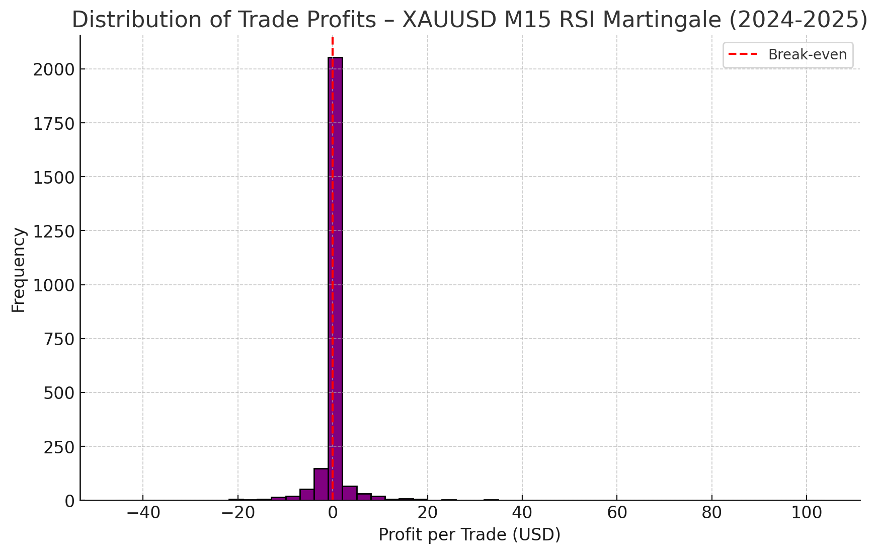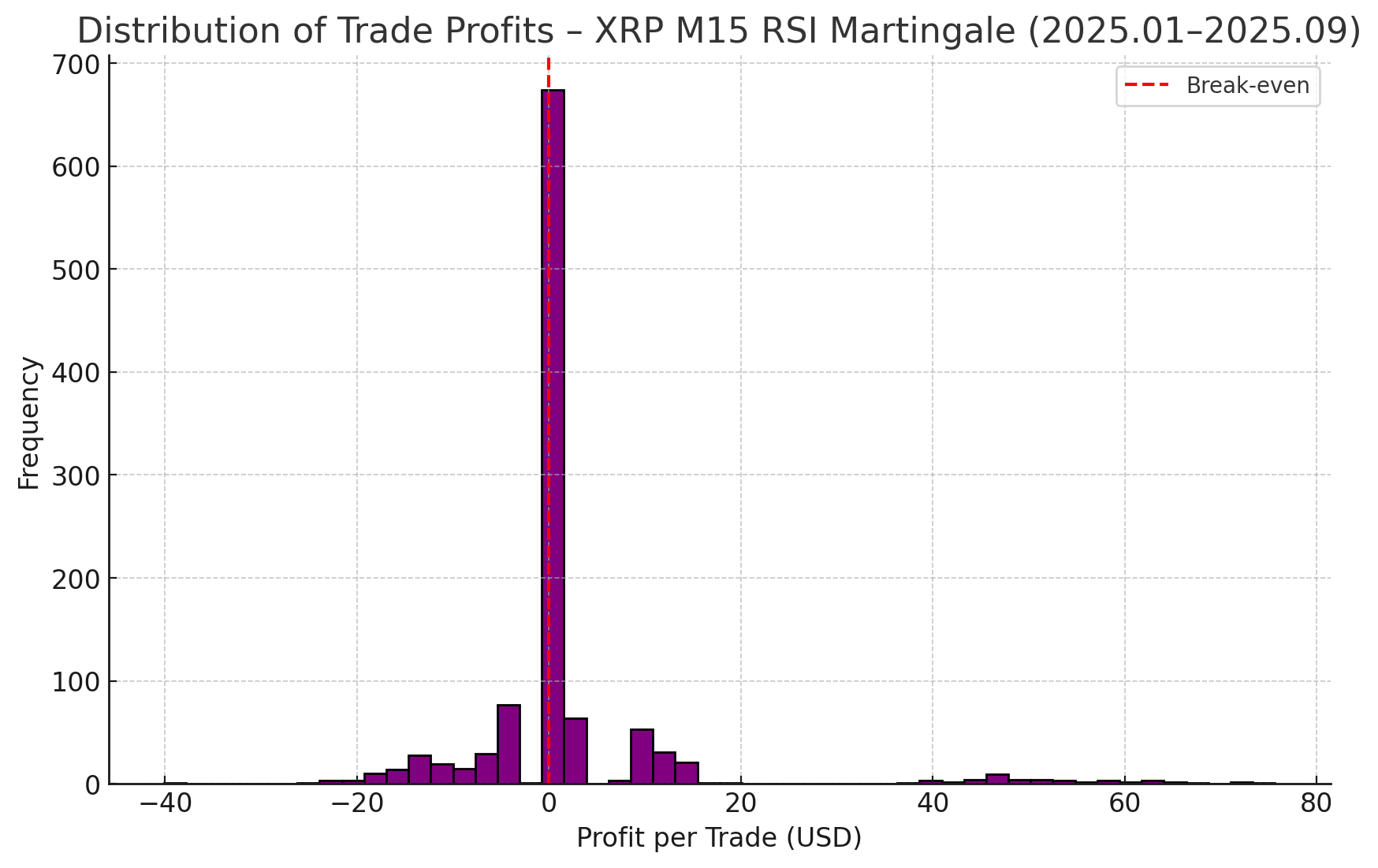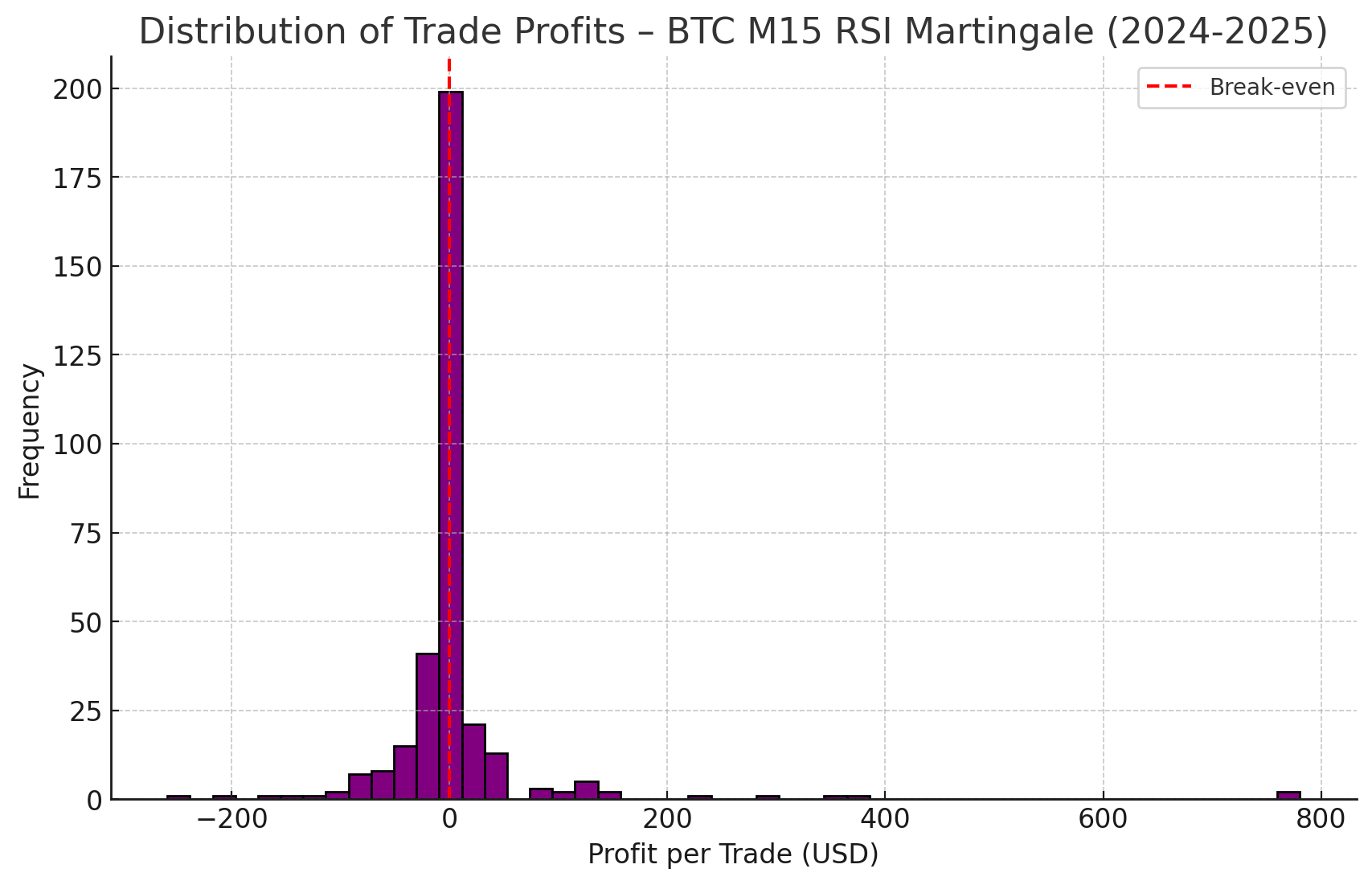 - 大部分收益来自小额盈利交易(马丁格尔的典型特征)。