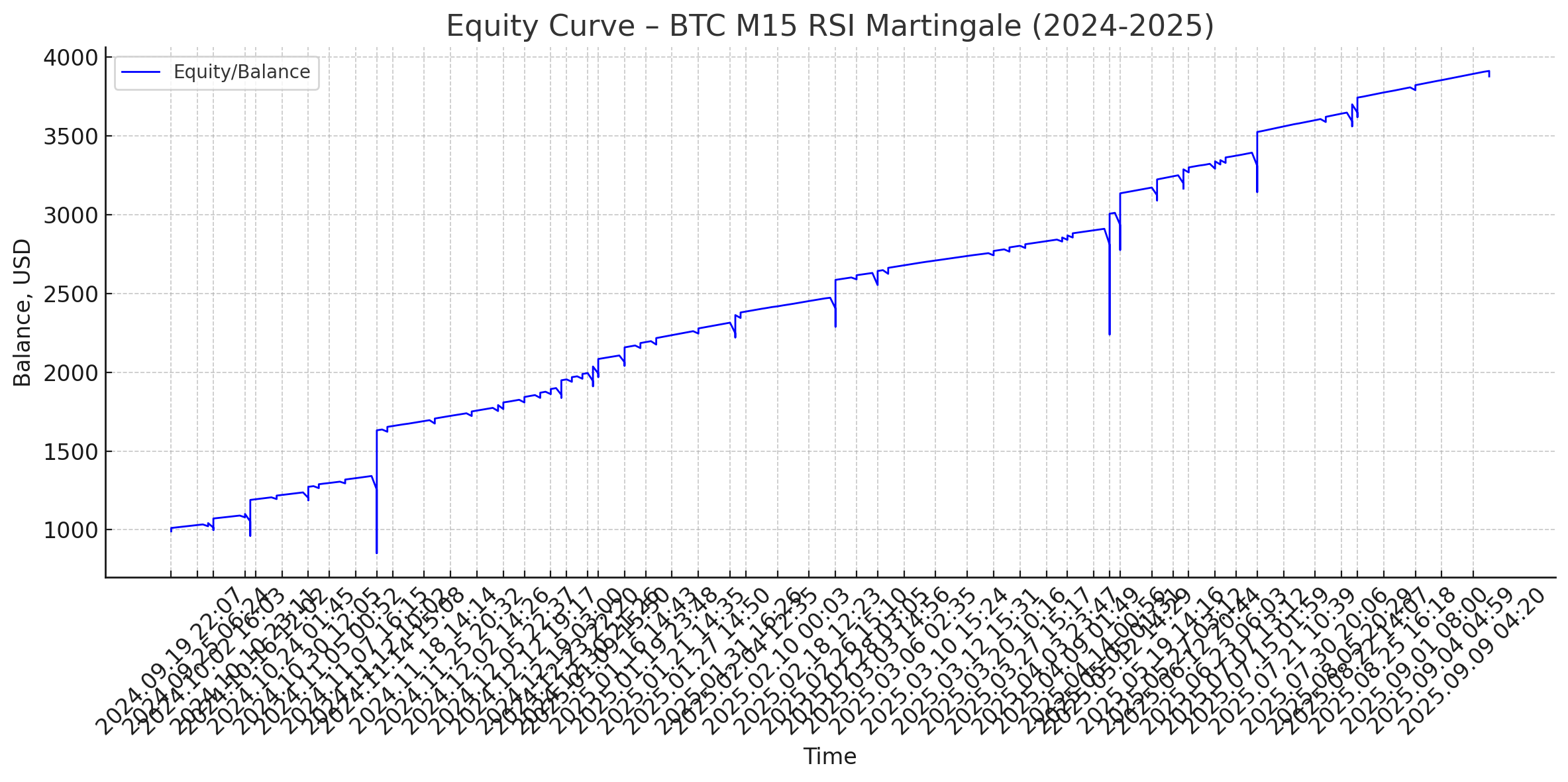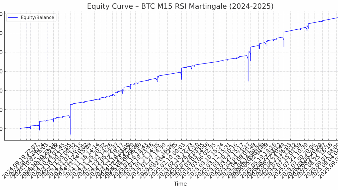 BTC M15 RSI 马丁格尔(2024-09 – 2025-09)摘要:
