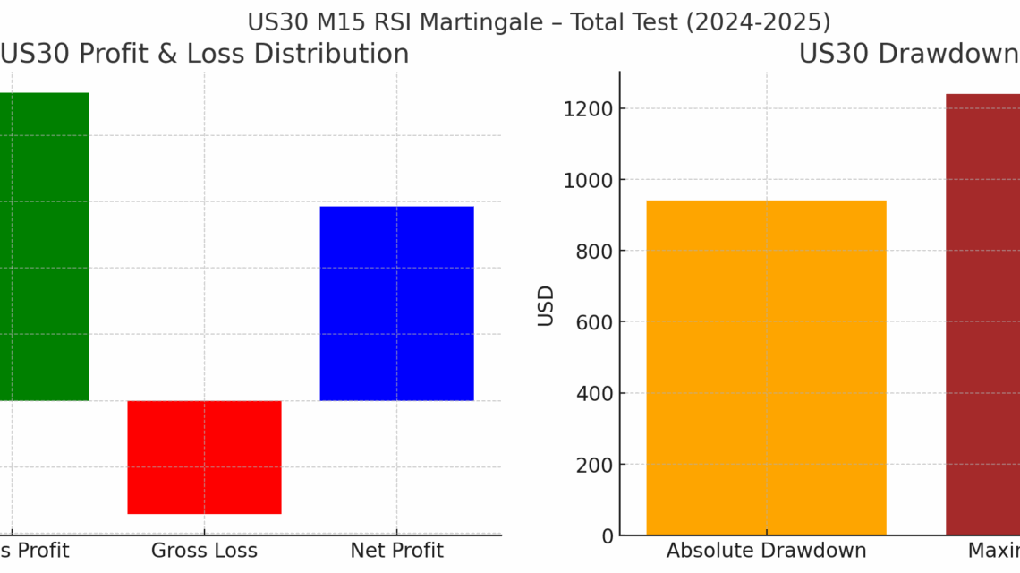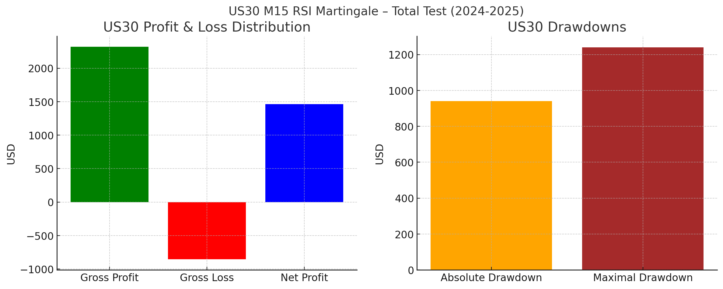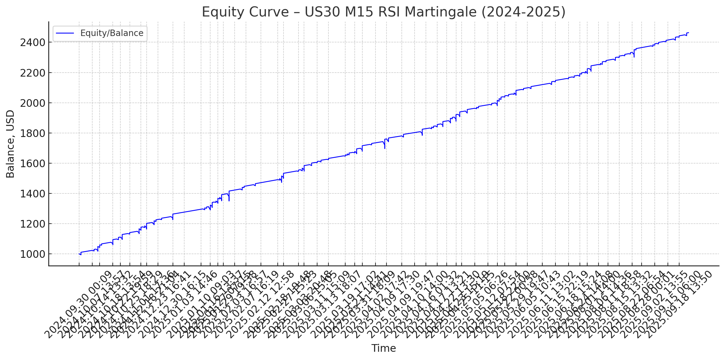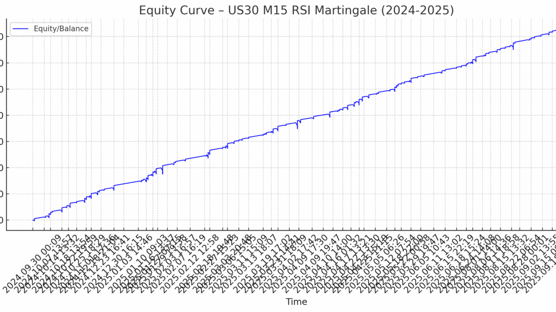 US30 M15 RSI 马丁格尔(2024-09 – 2025-09)摘要: