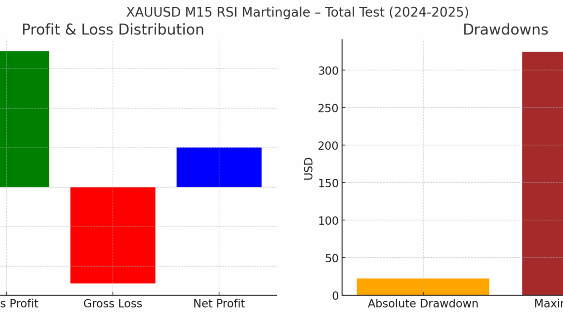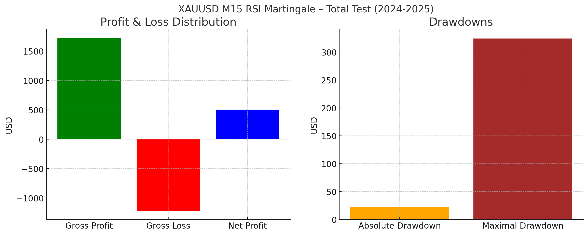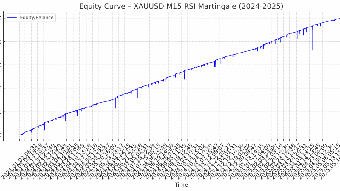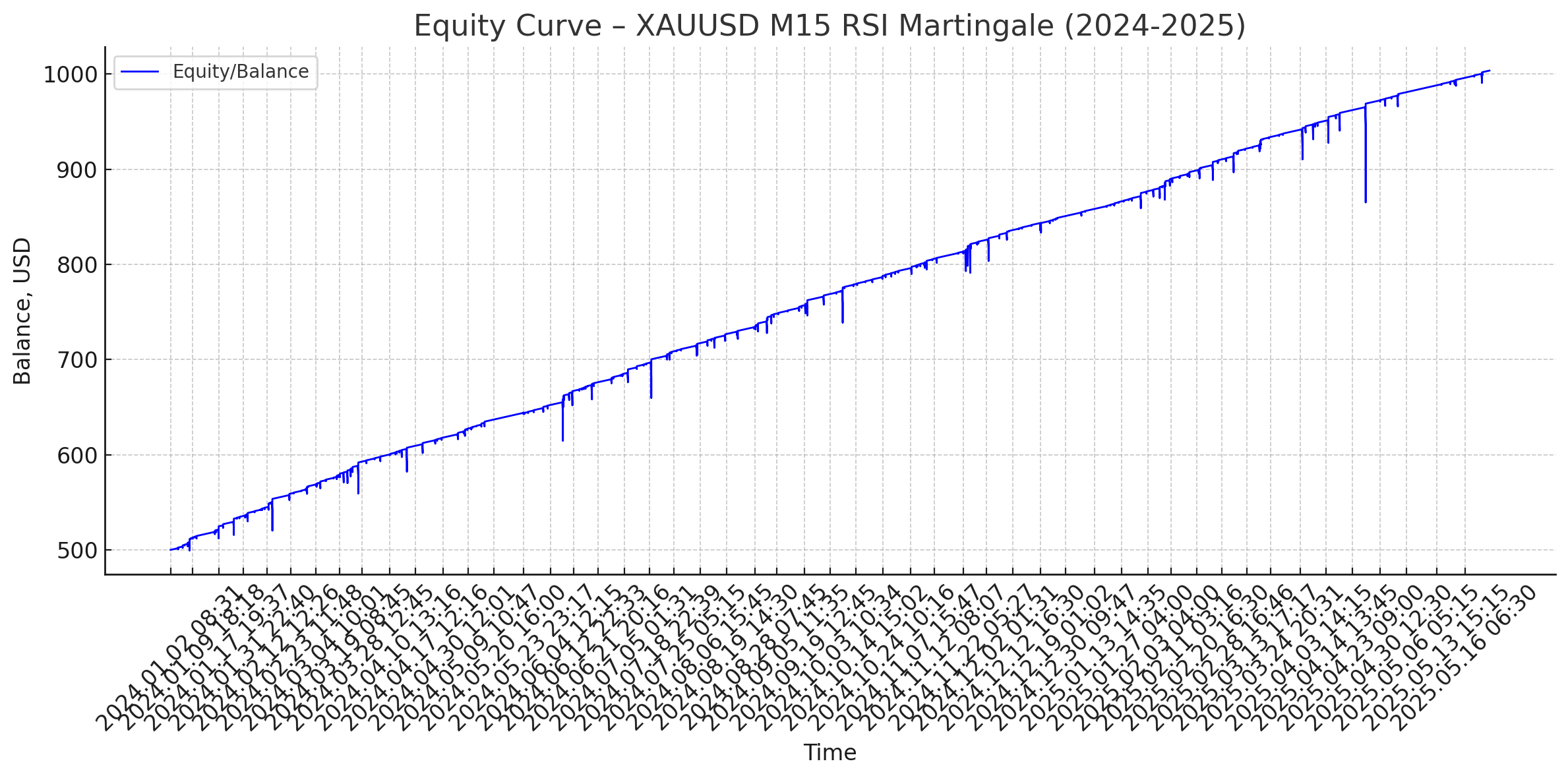 总测试(XAUUSD M15 RSI 马丁格尔,2024-01-01 – 2025-06-02)显示: