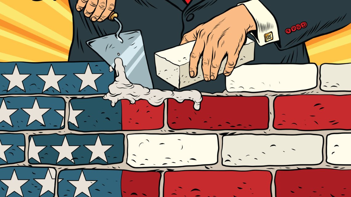 politician to build a wall on the USA border. United States flag. Illegal migration. Vintage pop art retro vector illustration. Brickwork